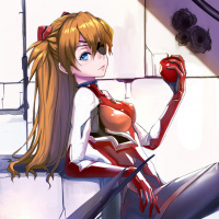 a piece of debris or rubble, possibly in a setting that suggests destruction or aftermath of some event. The character is holding an apple, which adds a somewhat surreal element to the image. In the background, there are elements such as cables and what looks like machinery or wires, contributing to an industrial or post-apocalyptic aesthetic. There's also some writing in the upper right corner that seems to be part of the artwork but is not clearly legible.