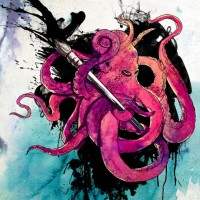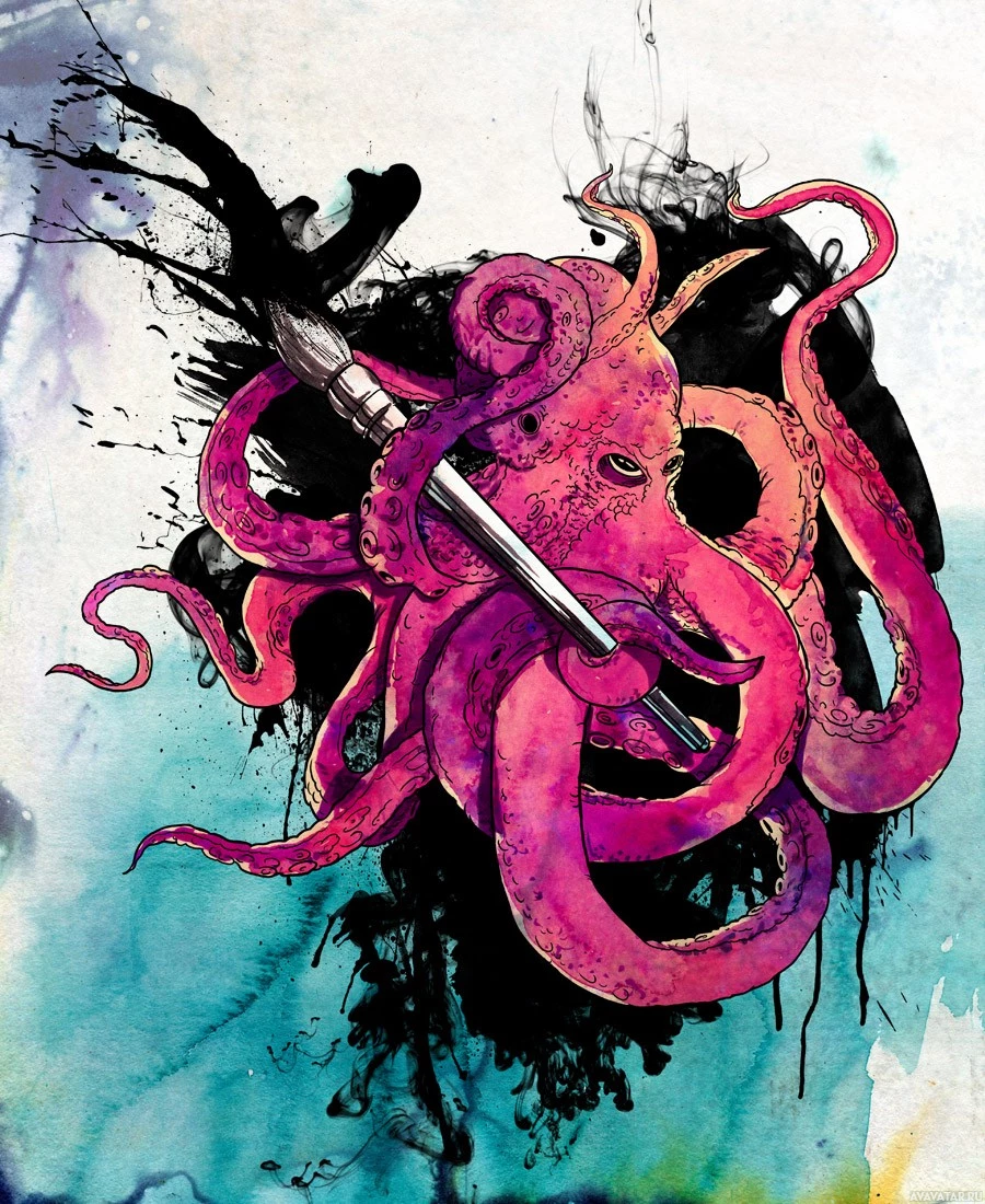 splashes of color that resemble paint or water effects. In its tentacles, there is what appears to be a syringe, suggesting themes related to art or self-defense. The background consists of dark lines that could represent