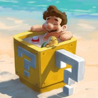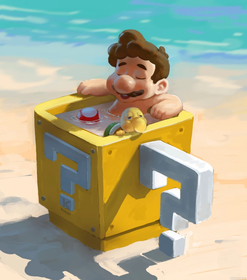 blue water and sand, suggesting a playful take on Mario's usual adventures in his signature red hat and brown overalls.