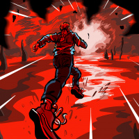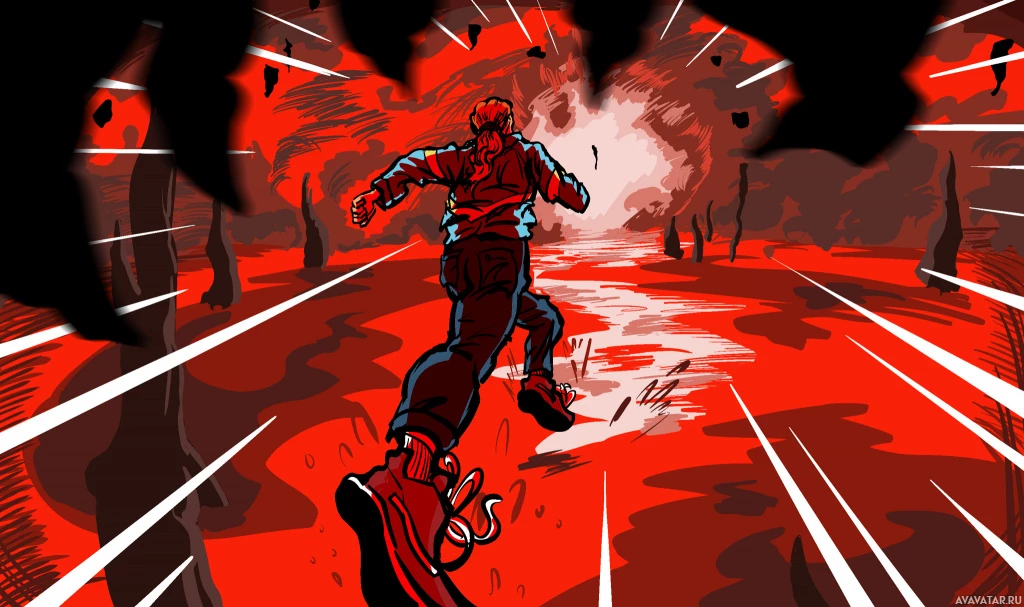 a fiery explosion or disaster. The figure is in motion, with their arms outstretched and legs trailing behind them. There's
