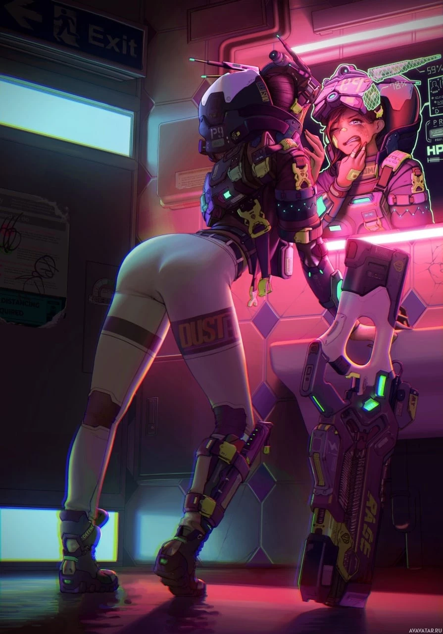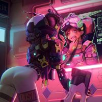 a female character wearing futuristic armor, standing next to another figure that appears to be an android or robot with human-like features. They are in what looks like a futuristic setting with a neon light and signs on the walls, possibly indicating
