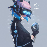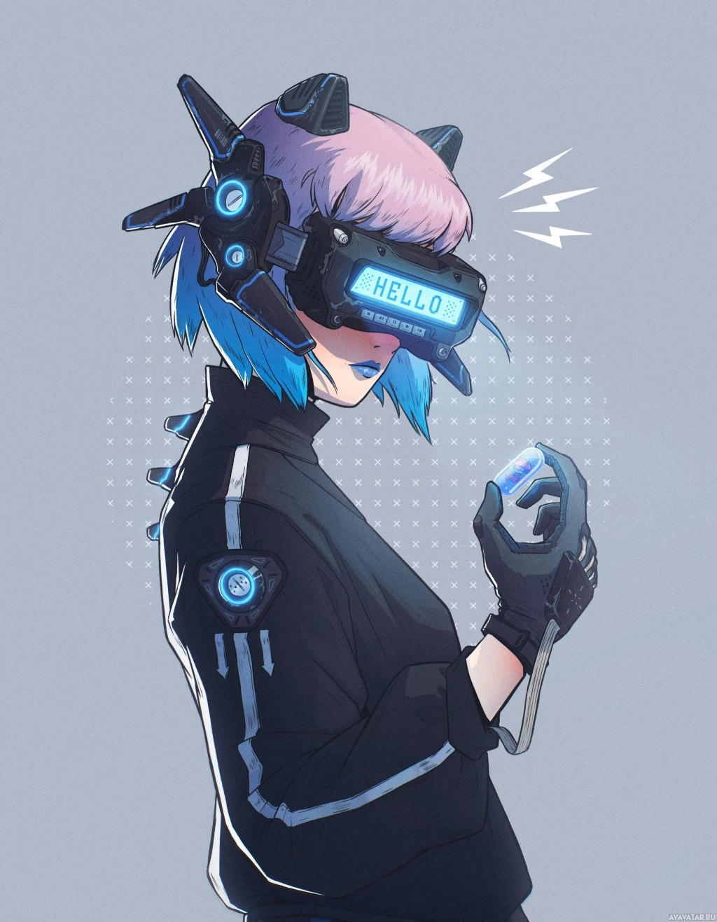 blue hair and is holding what appears to be a pair of virtual reality goggles in their hand. They are dressed in a sleek,