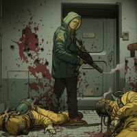 an emergency situation or some form of conflict. There's visible evidence of struggle or violence as indicated by the positions of the people involved.