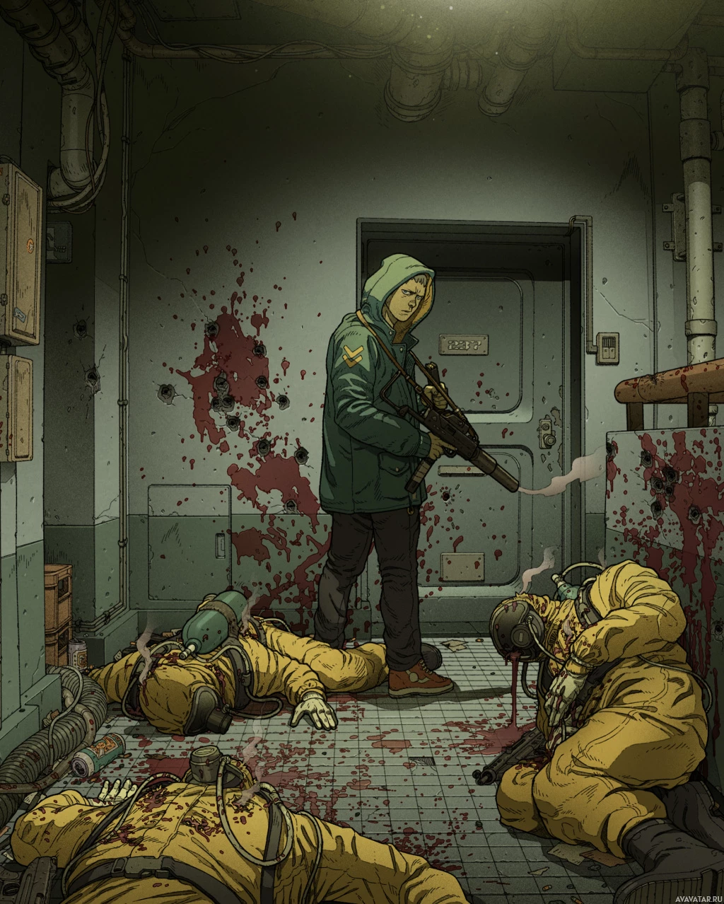 a grim scene where one man stands in the doorway of an industrial room. He is wearing a hood and has a gun pointed towards