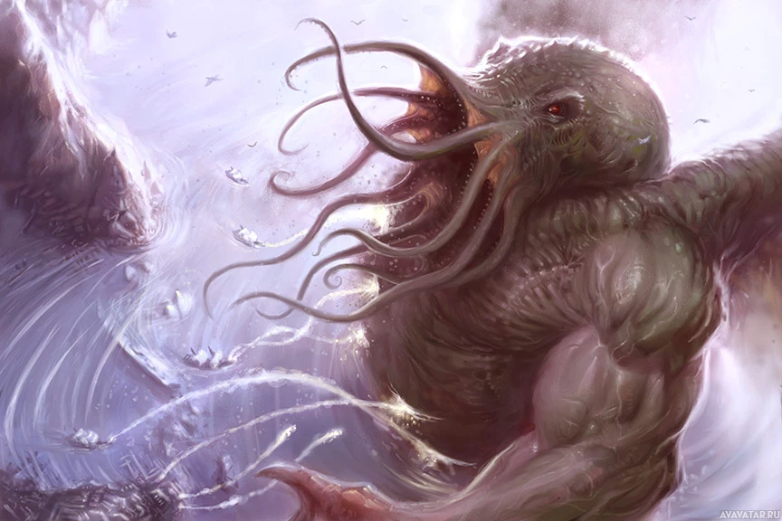 The image depicts a fantasy-style illustration of a creature that resembles Cthulhu, which is often associated with
