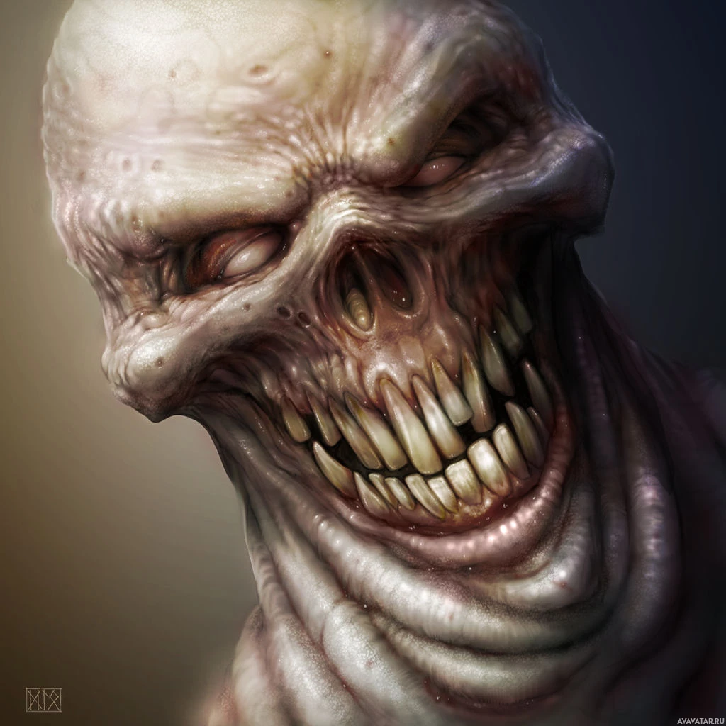 The image shows a creature with a pale, decaying appearance. It has a skeletal head and an exaggerated grin revealing