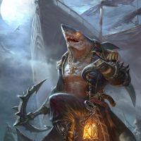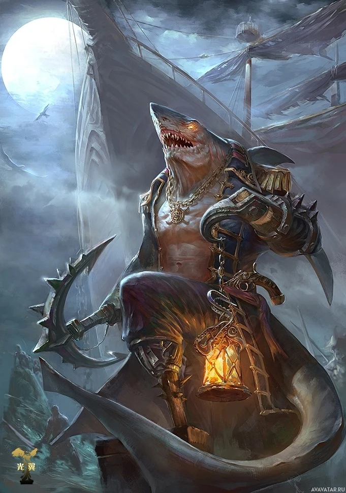 a mutant shark with human-like features. It's holding a lantern in its right hand and is sitting on what looks like an old shipwreck under