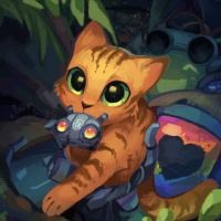 an illustrated scene featuring a cat, specifically an orange tabby cat with distinctive eyes. This cat is standing on its hind legs and has mechanical attachments or parts that resemble those of a robot, suggesting it might be from