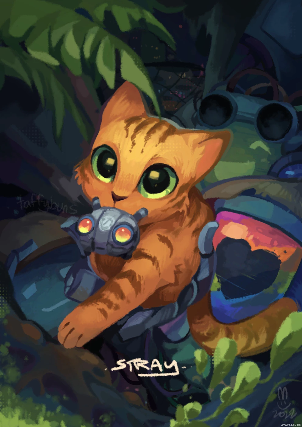 the video game "Stray," which features such characters in a post-apocalyptic setting. In addition to the cat, there's also another character in the background who appears to be wearing some sort of armor with