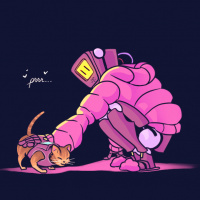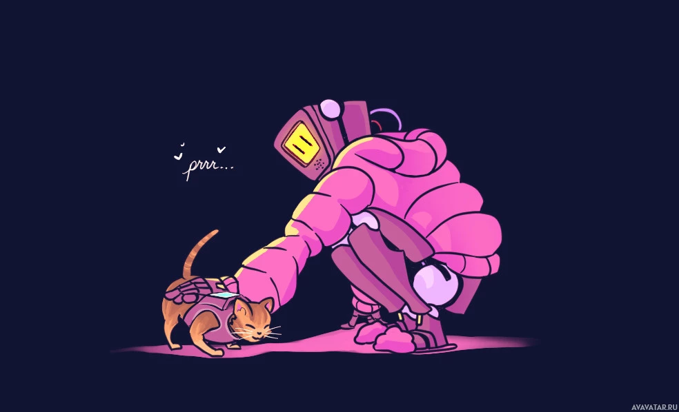 На картинке изображена анимированная сцена с участием двух персонажей. Один из них - робот, возможно, из игры Stray, а другой - кот. Кажется, что робот дружелюбно взаимодействует с котом. Они расположены на темном фоне, который контрастирует с их яркой внешностью.