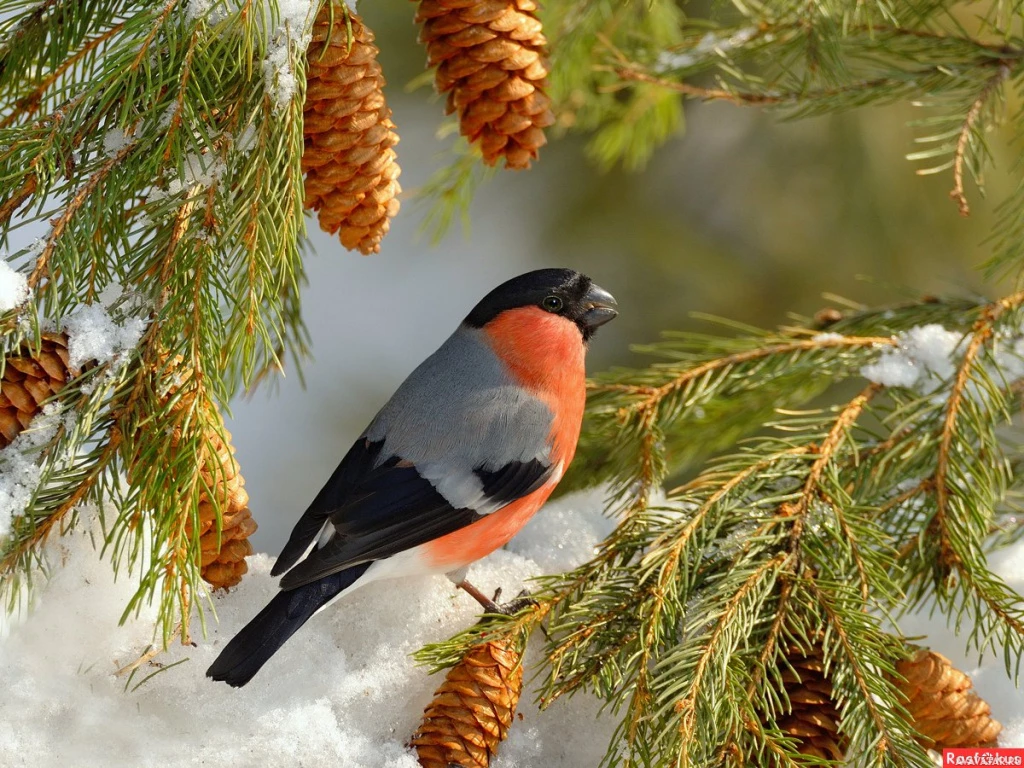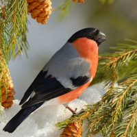 На картинке изображена птица, вероятно, снегирь, сидящая на чем-то похожем на еловые ветки, покрытые снегом. Птица повернута лицом к левой части изображения, а ее перья окрашены в оттенки серого, красного, желтого и черного.