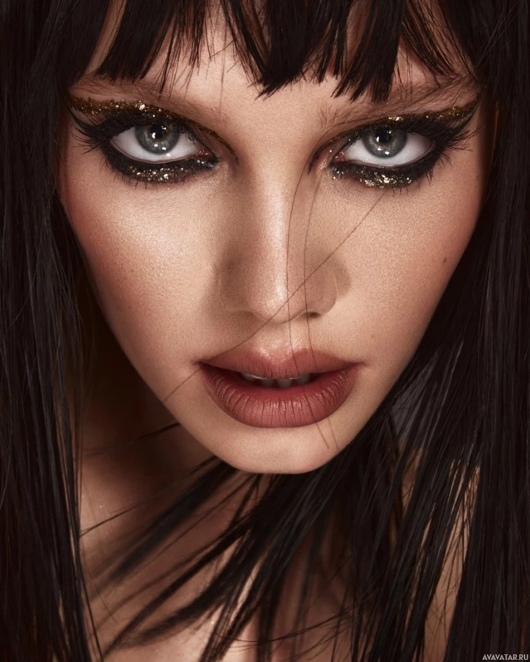 blue eyes, and is looking directly at the camera with an intense expression. Her makeup includes prominent eyeliner and what seems to be gold or metallic-colored accents around her eyes, which adds to her