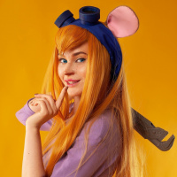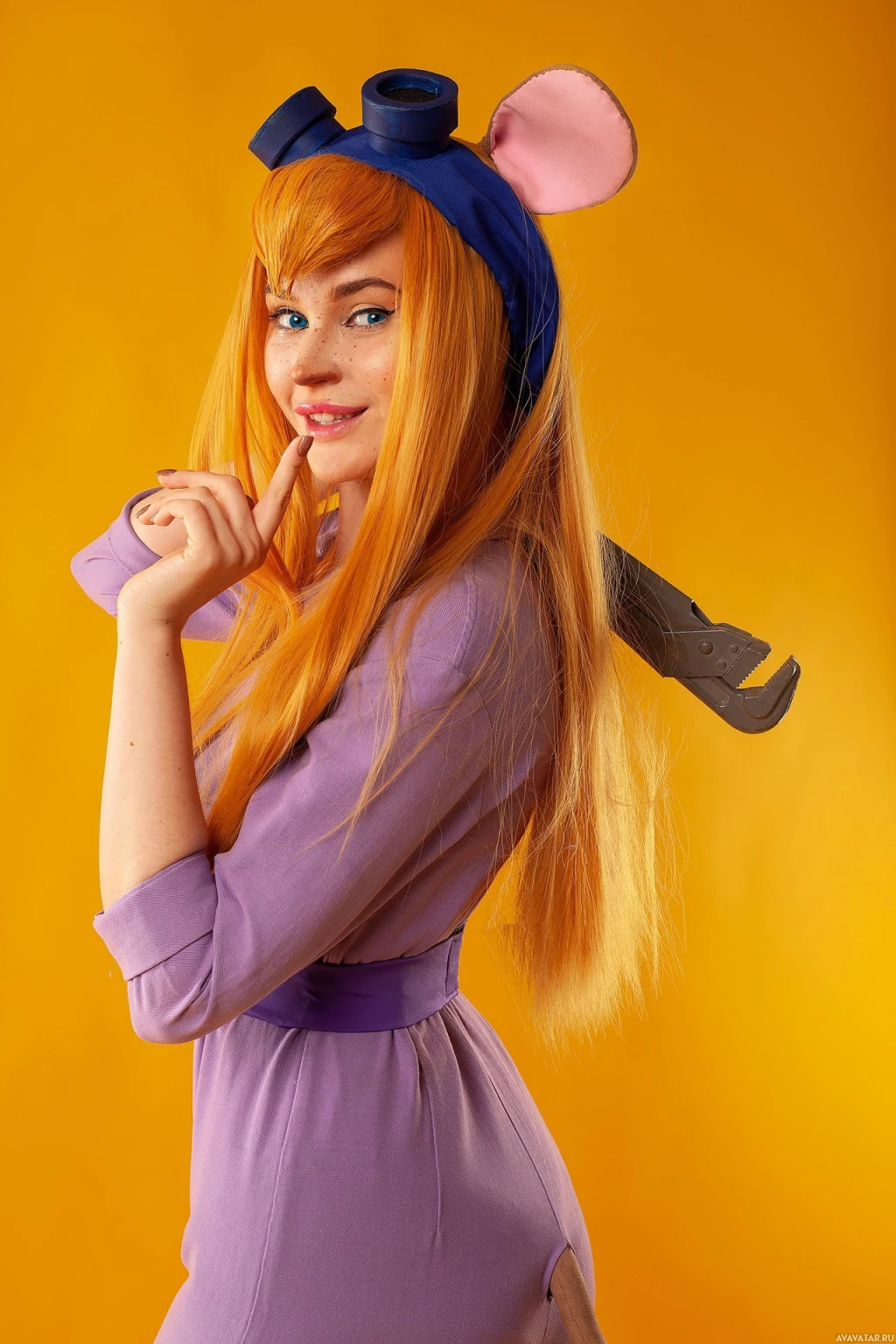a cosplay outfit that resembles Chip 'n Dale's Rescue Rangers character, Gadget Hackwrench. This is indicated by the costume and accessories such as the hat with ear-like protrusions on either side, which is characteristic of Gadget's appearance in