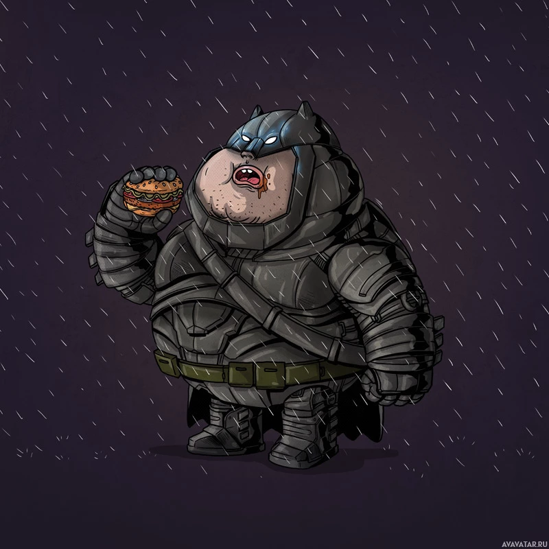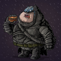 Dark Knight" series. This character is depicted in a humorous and exaggerated manner, with a large, rounded body and a head that seems disproportionately small compared to the rest of the body. The character is eating what appears to be a burger or sandwich, adding to