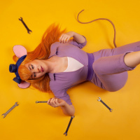a purple costume and has mouse ears, which is characteristic of Gadget's design in the series. In front of the person are