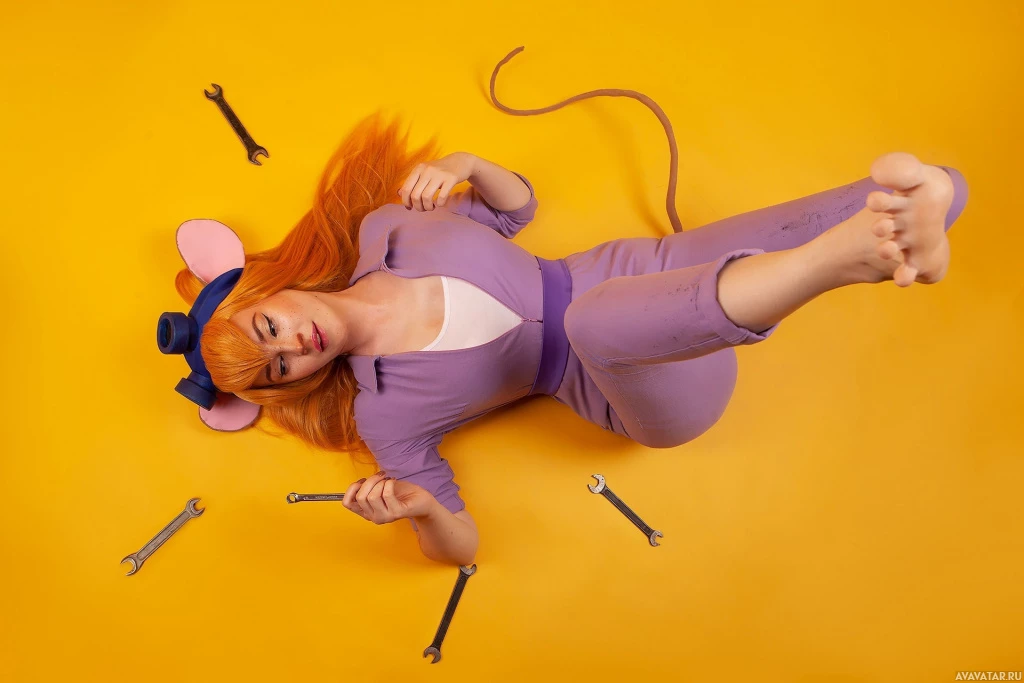 Gadget Hackwrench from "Chip 'n Dale: Rescue Rangers," lying on their back with their feet in the air. The individual is wearing
