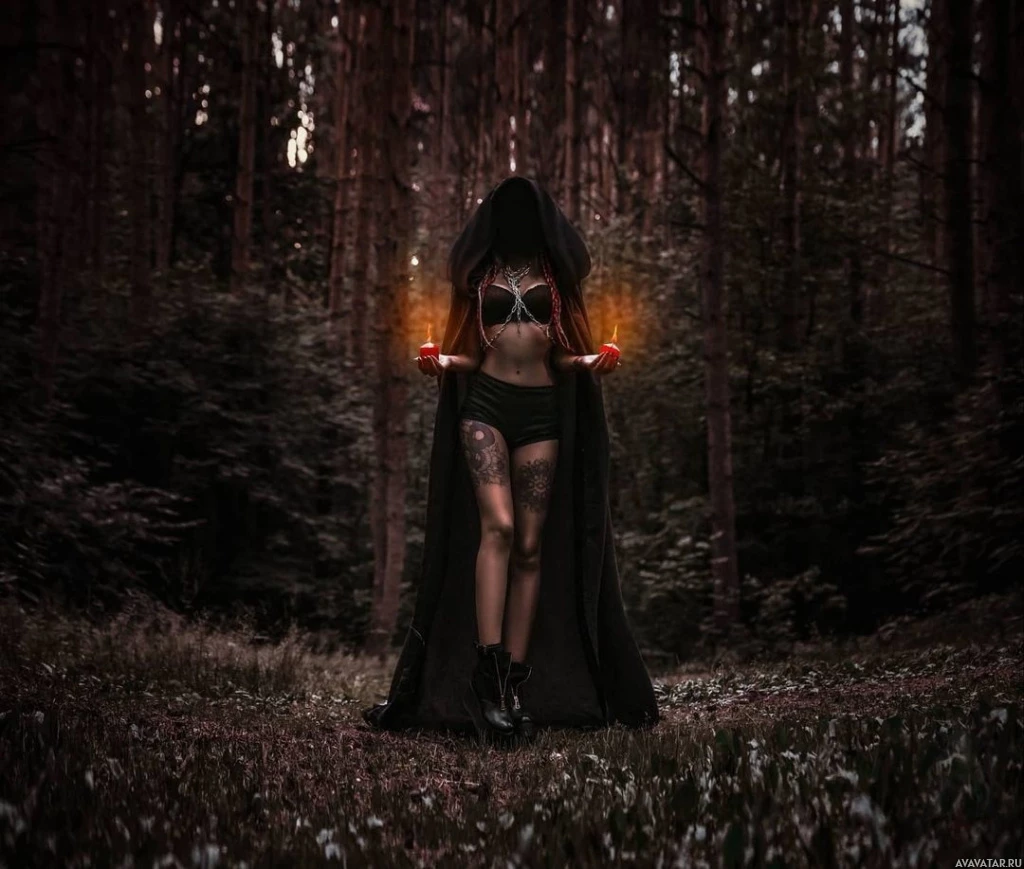hooded cloak and has tattoos visible on her skin. In each hand, she holds a candle that is lit, which adds a mystical or otherworldly feel to the scene. The light from the candles contrasts with