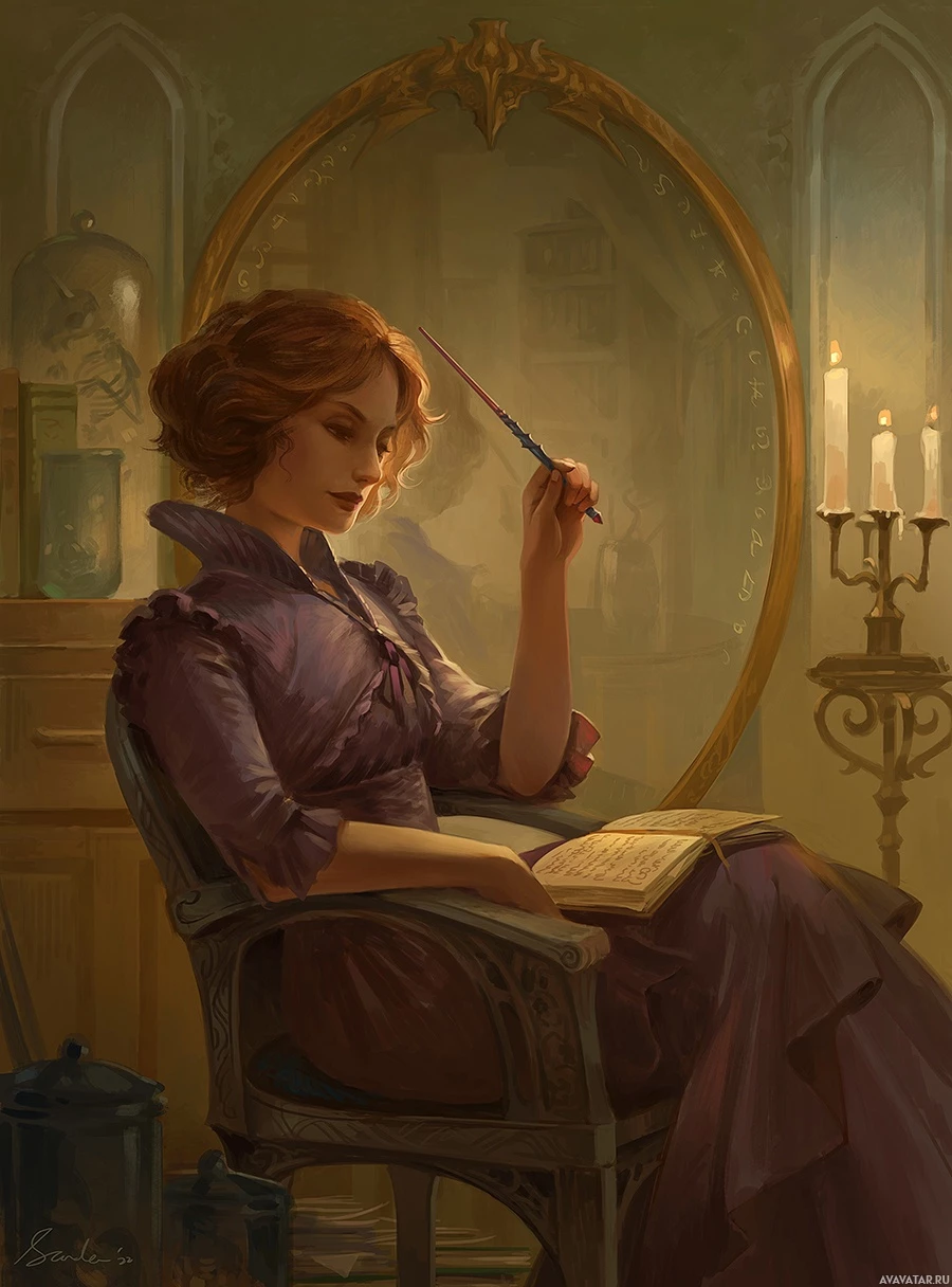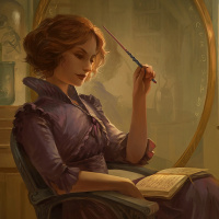 era clothing, suggesting the setting might be from an earlier time period. In her hand, she holds a pen and appears to be writing or reading from a book. There are various items around her, such as a bottle that may contain ink, a small chest, and what looks like a vintage mirror with candles on it, adding to the ambiance of an old-