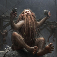 a fantasy scene featuring a character with long hair and a beard, sitting cross-legged on what appears to be a rock or platform. This character is holding a device that resembles a smartphone, and the expression on their face suggests they are either smiling or showing off the device. To the right of this central figure, there's another character who seems to be observing or assisting