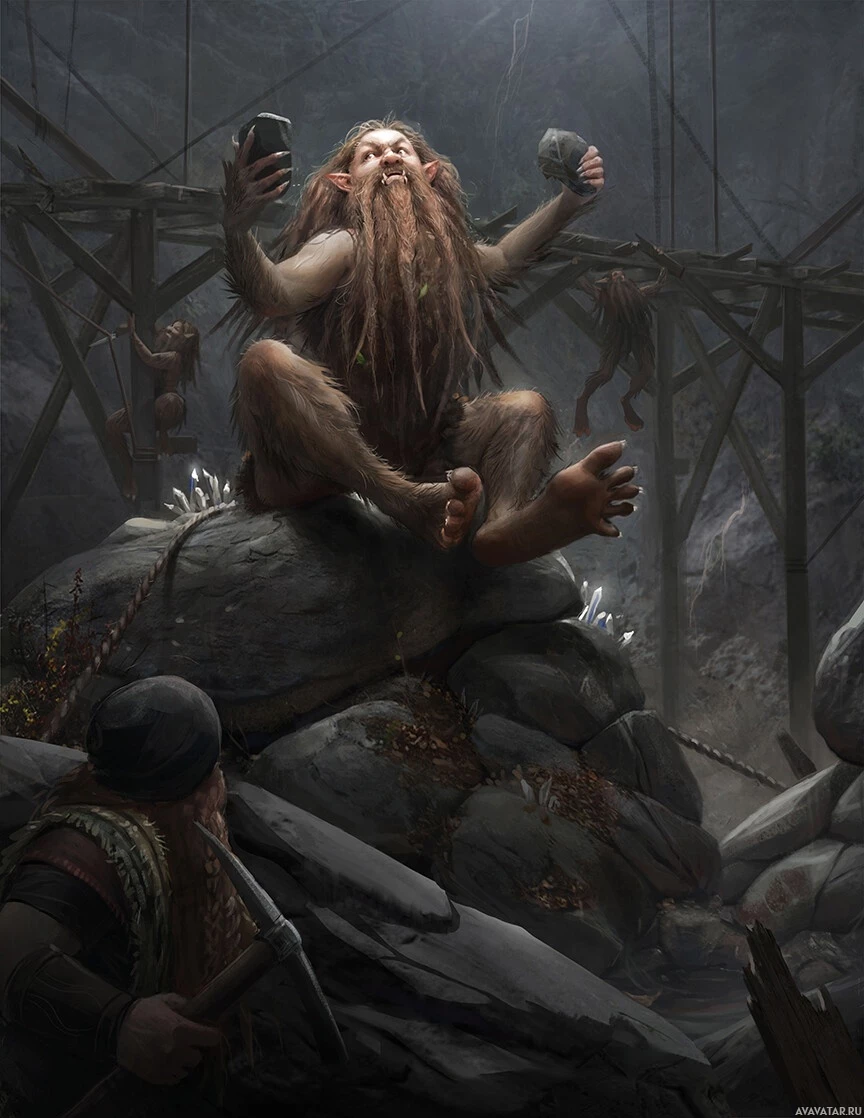 a natural environment, with a structure that looks like part of a bridge or wall in the background. There are also other figures or objects in the image that appear to be fantasy elements, which contribute to the overall fantastical theme of the illustration.