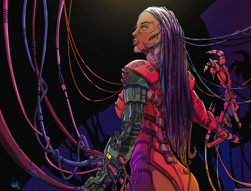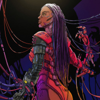 The image depicts a character that appears to be a fusion of human and robotic elements. The character is shown from behind, looking over their shoulder with one arm extended outward as if reaching or interacting with something not visible in the frame. The character's attire consists of red and purple metallic parts with wires intertwining around them, suggesting