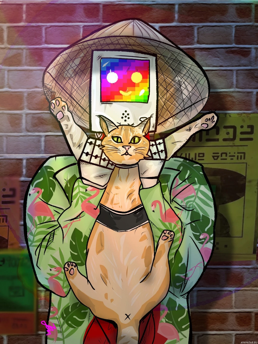 bright colors with a pattern that could be interpreted as a floral or tropical design. In front of the character, there's a colorful poster with various elements like a rainbow, stars, and what seems to be