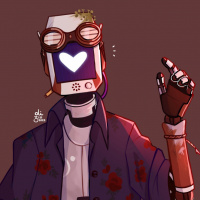 a protective suit with patches or splatters resembling blood, which could imply that the character has been through some kind of struggle or battle. The robot's head is decorated with what appears to be