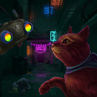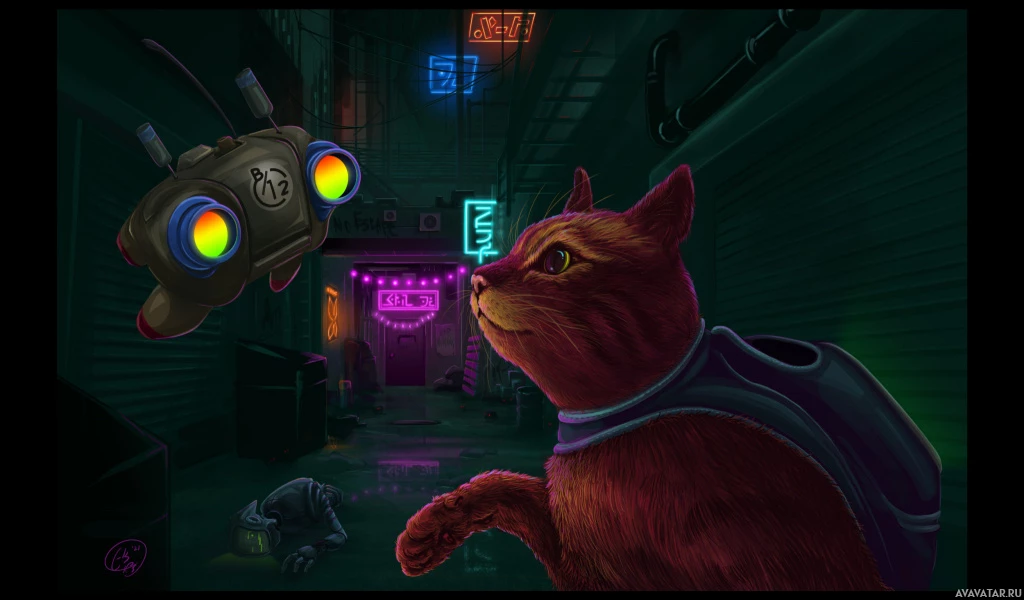 a video game or an animated piece set in a neon-lit alleyway, which might remind viewers of the game "Stray." The atmosphere suggests an adventure or exploration theme.