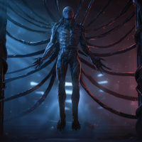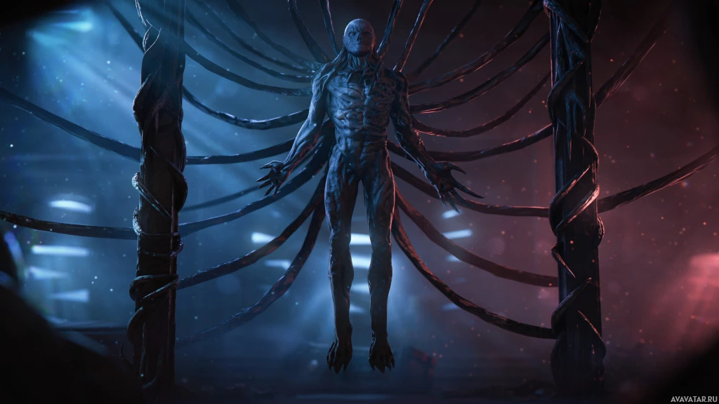 a futuristic setting that includes intricate structures and what looks like advanced machinery in the background. The color palette is dominated by cool blues and reds, which creates a dramatic and otherworldly atmosphere typical of science