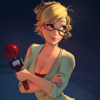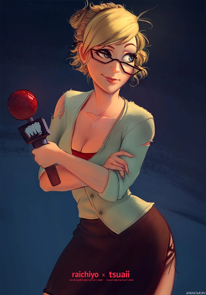 blonde hair and glasses. She is holding a microphone, suggesting she might be a host or reporter for a broadcasting event or show. The character is dressed in what seems to be a formal attire, possibly a news outfit or professional wear, which complements her