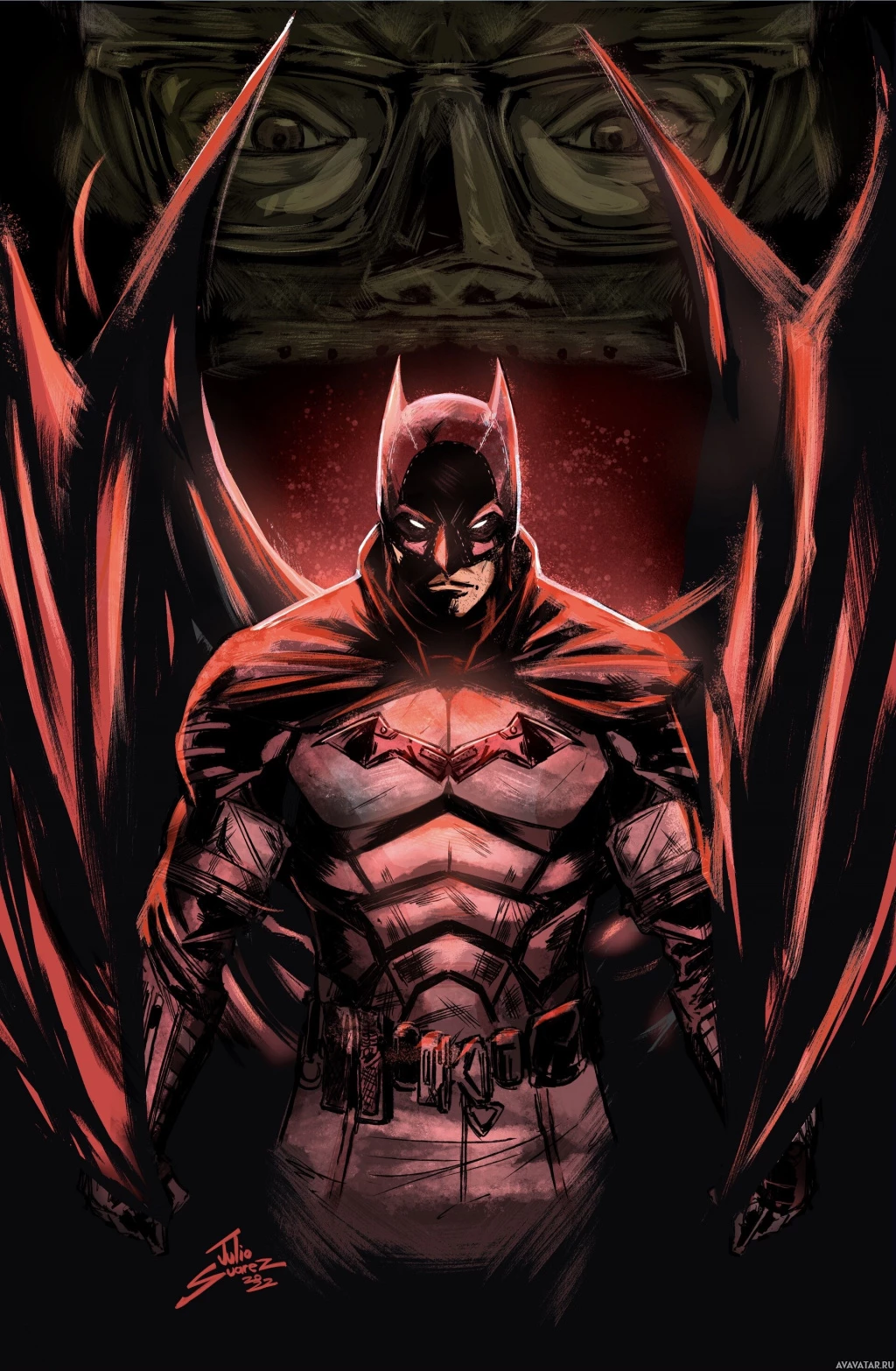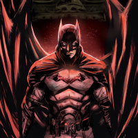 an illustrated character who appears to be Batman. He is standing in
