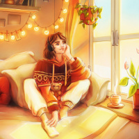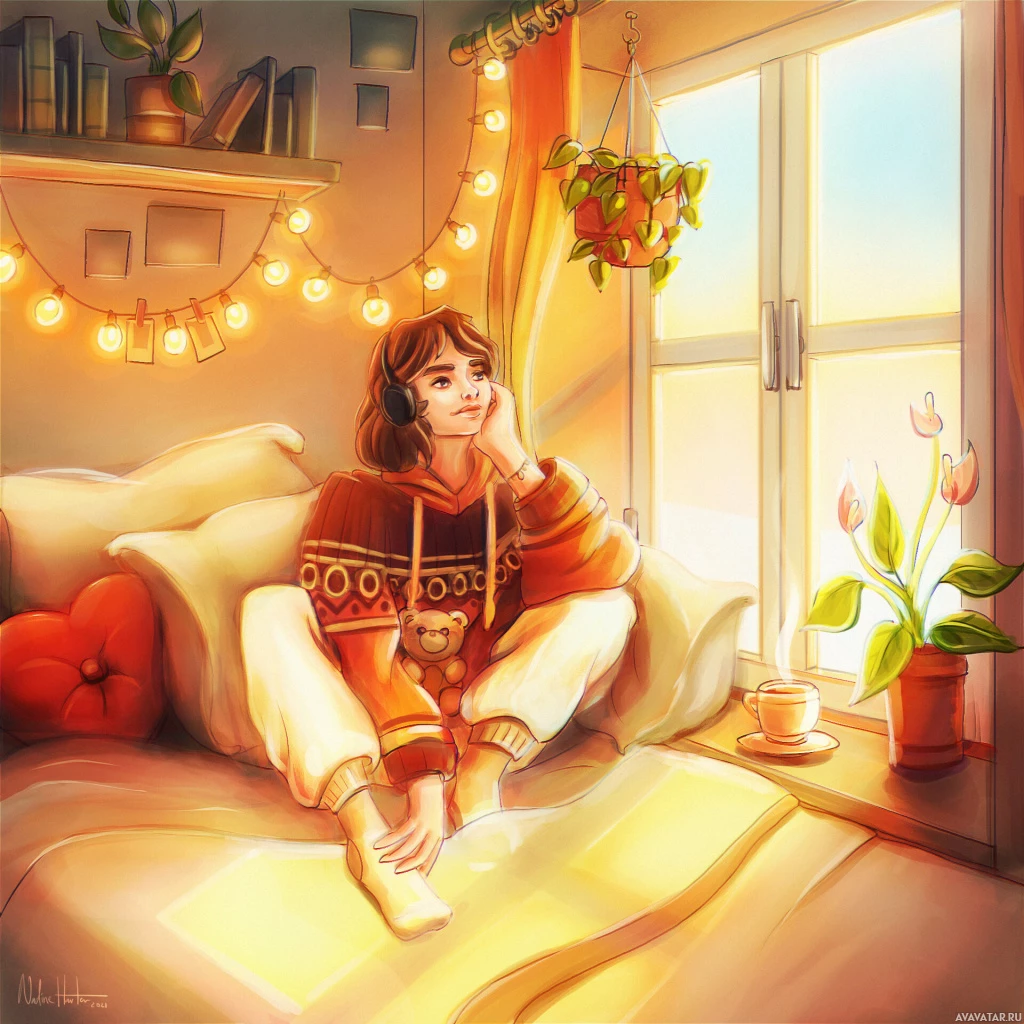 a warm glow. To her right, there's an indoor potted plant and to the left, a small