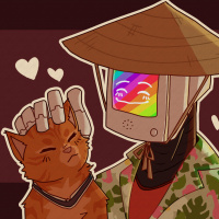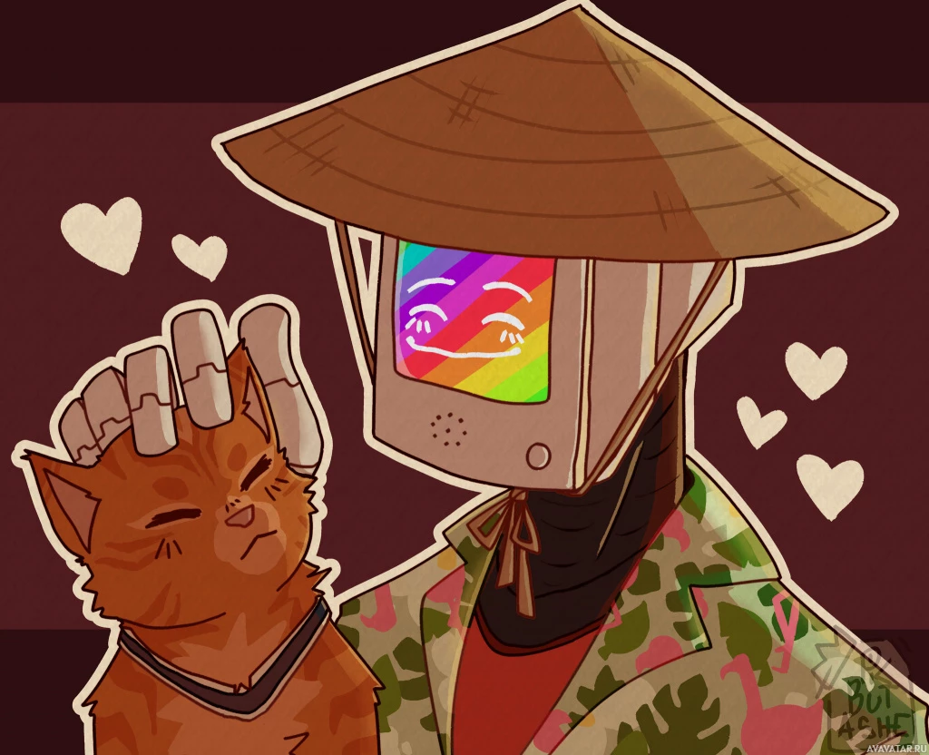 The image features an illustration of a robot and a cat. The robot is depicted wearing what appears to be a hat with a face on it, resembling a character from