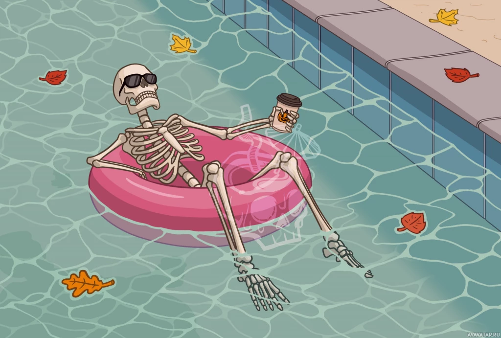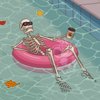 The image shows two skeleton characters lounging on a pink inner tube in