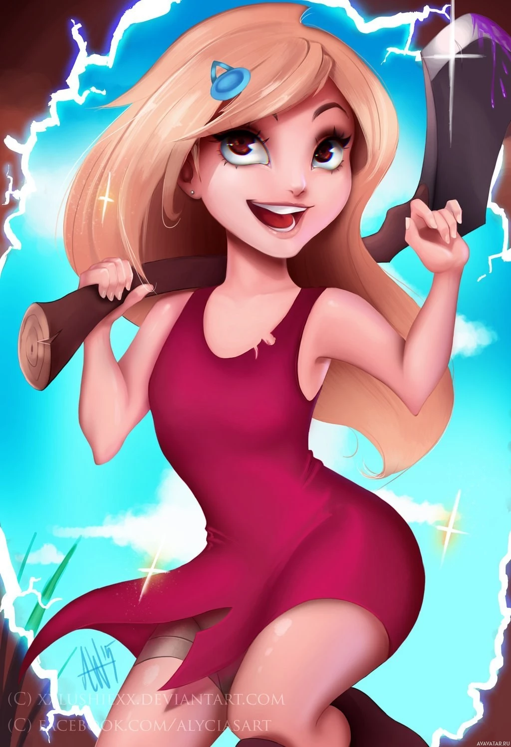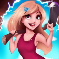 a dynamic pose, wielding an axe with confidence and enthusiasm, as she smiles broadly at the viewer. The background is simple, featuring