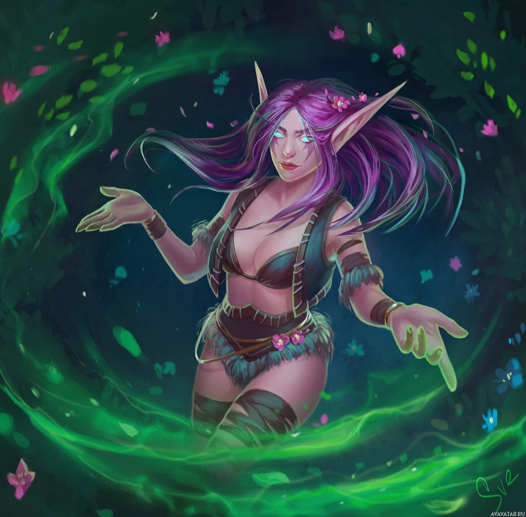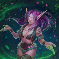 a fantasy character that appears to be an elf with purple hair. She is dressed in attire that resembles that of a warrior or adventurer, complete with armor pieces and accessories that suggest a setting within a magical or otherworldly environment. The background features greenery and what looks like
