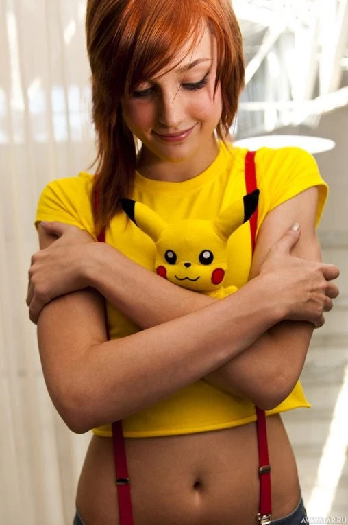 a yellow shirt with red suspenders and holding a plush Pikachu toy. The individual's eyes are closed, and they are smiling as if enjoying the moment or feeling a connection with the character being portrayed. This scene is likely from