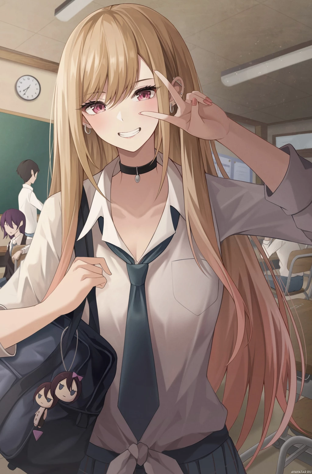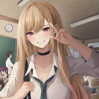 long hair, wearing school uniform. She is smiling and making a peace