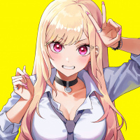 blonde hair and is wearing a blue shirt with a collar, paired with a black choker necklace. Her pose suggests she is in mid-gesture, possibly making a playful or enthusiastic gesture with her hand. The character's expression is cheerful and energetic, indicating that she might be excited about something or simply enjoying the moment.
