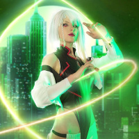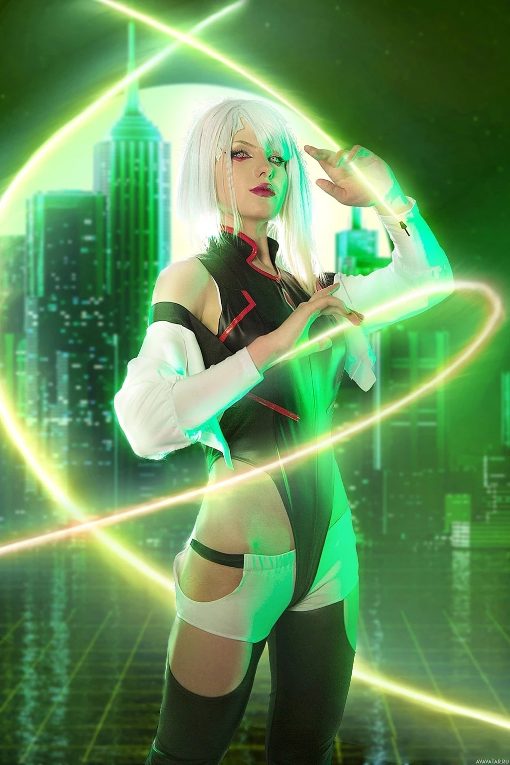 blonde hair and is wearing a black suit with green accents, which are signature elements of Lucy's outfit in the game. She is also holding what appears to be a futuristic handgun or weapon in her left hand. The background suggests a cyberpunk