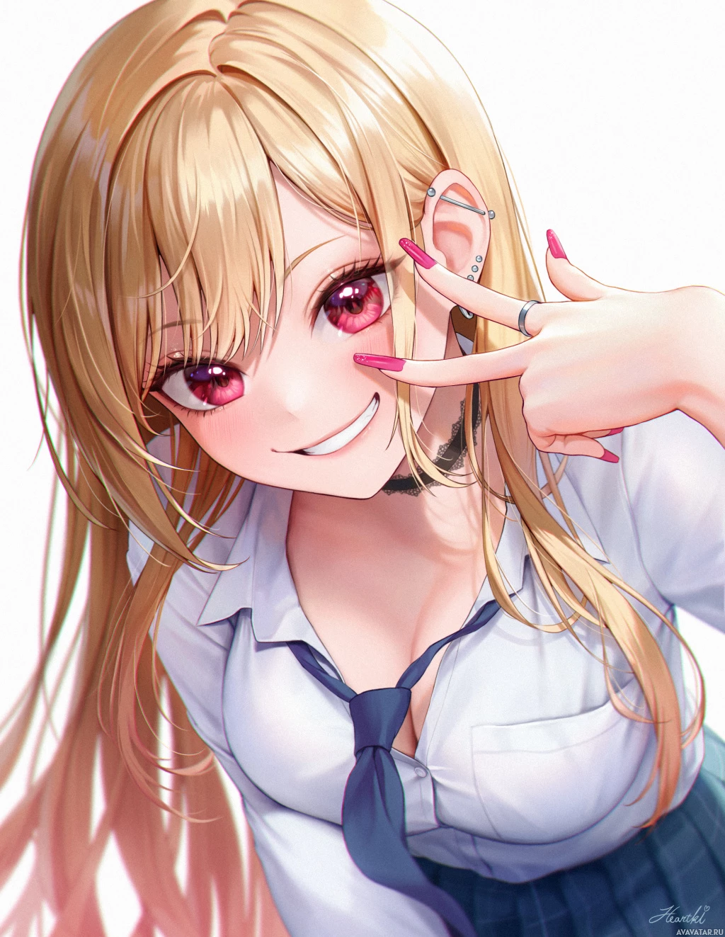 an illustrated character who appears to be Marin Kitagawa, a character from the "Love Live! School Idol Project" series. The character is smiling and giving