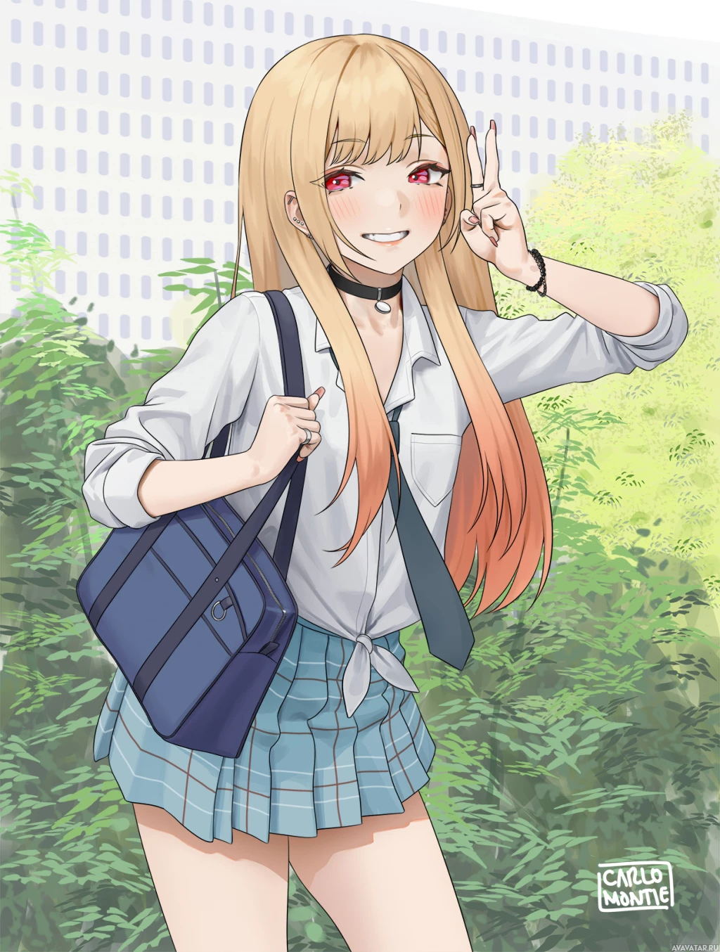 a school uniform consisting of a white shirt, blue tie, and skirt, along with black shoes. The character has