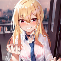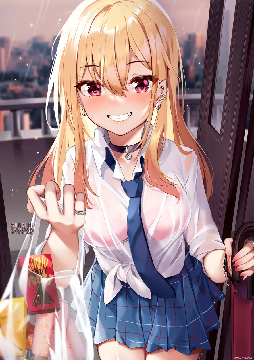 blonde hair, wearing a school uniform with a blue tie and holding what appears to be a transparent object or plastic bag. The background suggests a cityscape at sunset or during evening hours, as indicated by