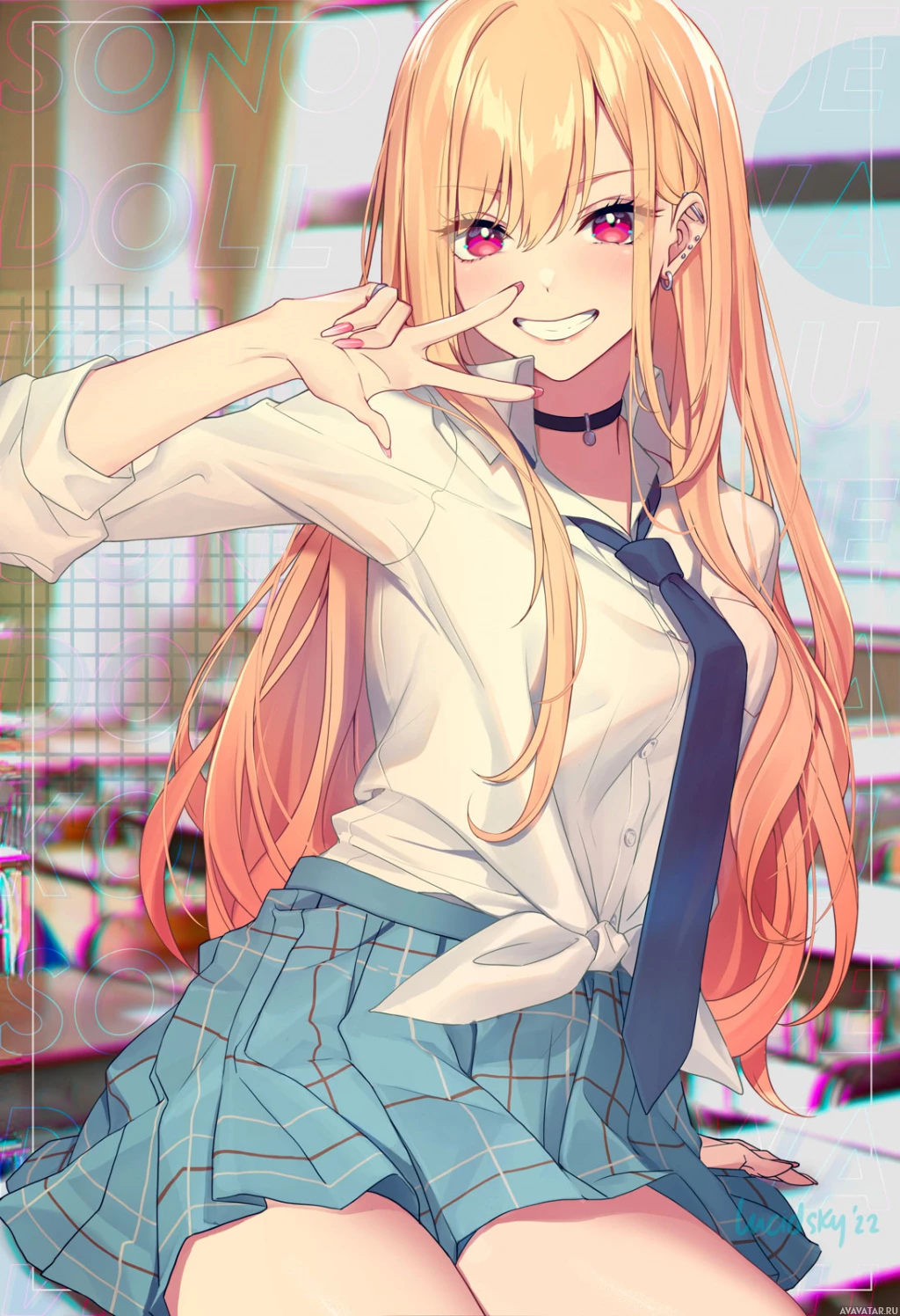 blonde hair and blue eyes, wearing a white shirt with a black tie. She appears to be in a playful or happy pose, smiling broadly while looking towards the viewer. She's also wearing a plaid skirt, which is characteristic of her