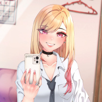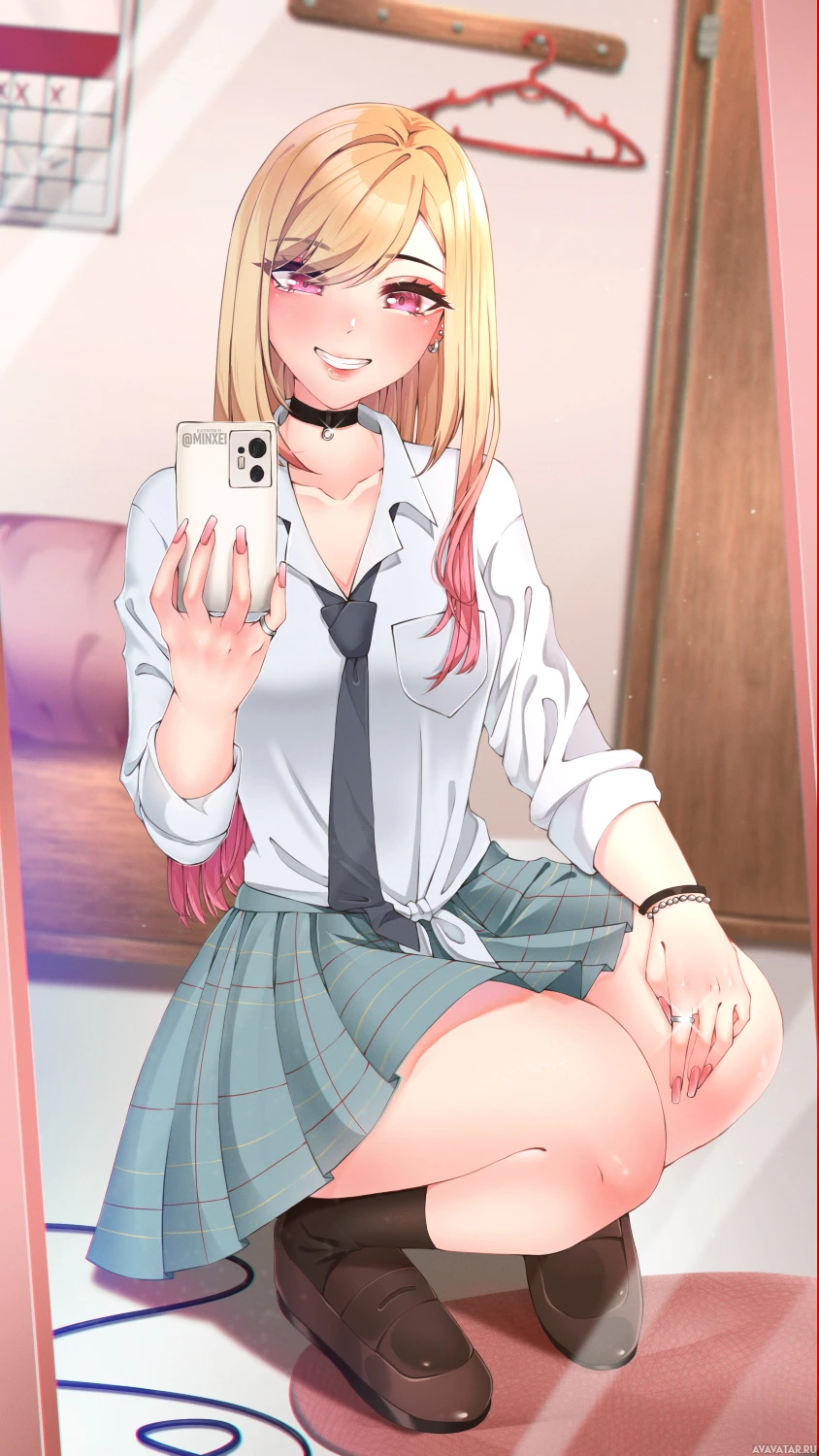 an animated character who appears to be Marin Kitagawa. She is depicted in a pose that suggests she's taking