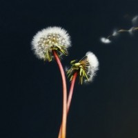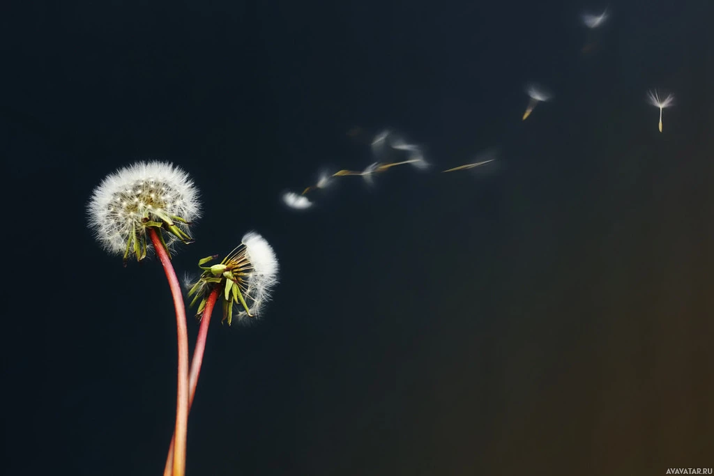 Картинка показывает одуванчик в фокусе, с его пушистой семенной головой в резком контрасте с размытым фоном. Существует тонкий эффект движения, который заставляет казаться, что семена падают или отдуваются от основного одуванчика. Цветовая палитра кажется приглушенной, с темными тонами, доминирующими на сцене.