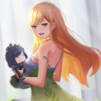 blonde hair and red eyes. She is wearing what appears to be