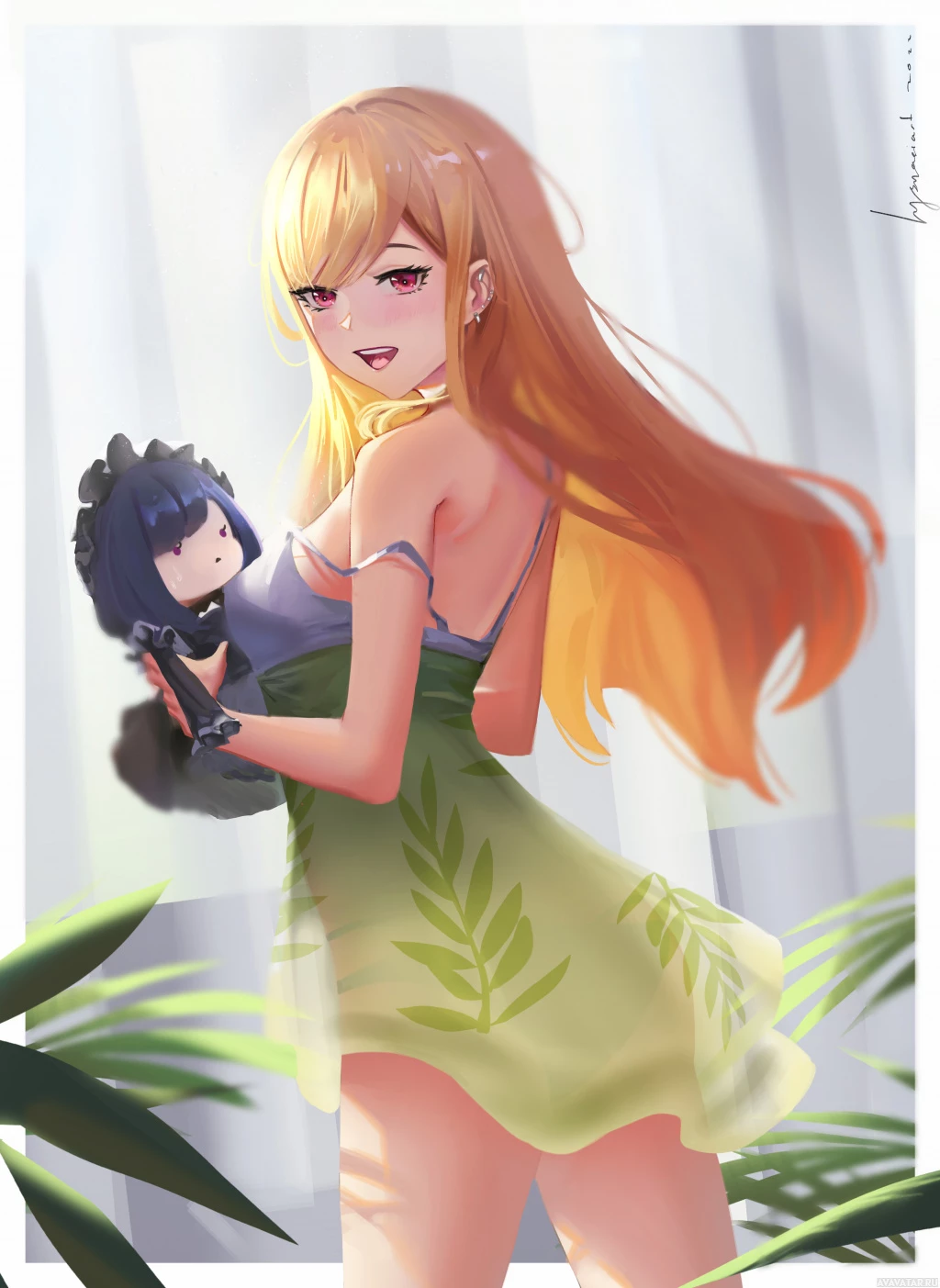 a green dress or swimsuit and is holding a stuffed animal. There's a window in the background that allows