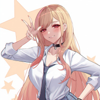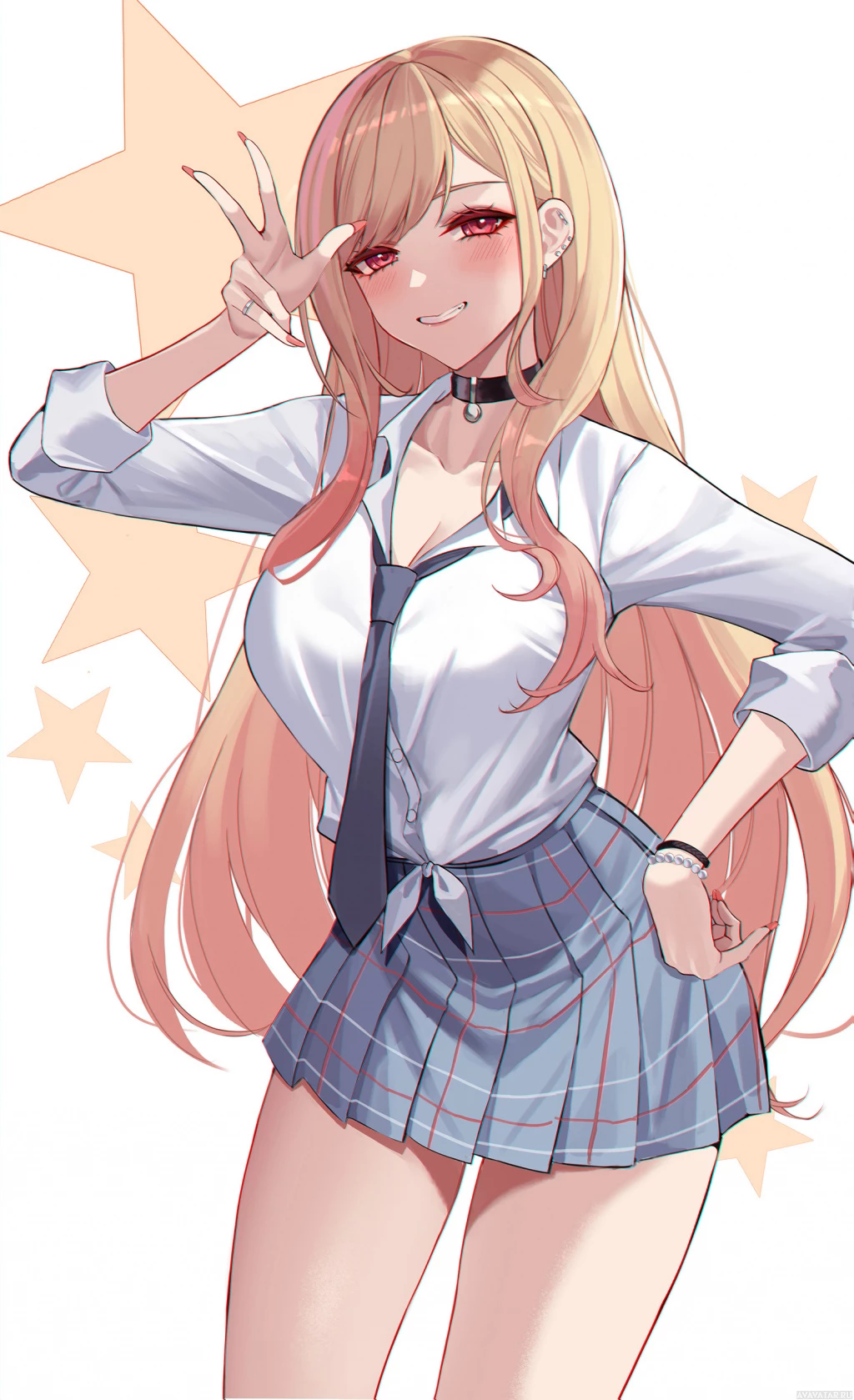 blonde hair, wearing a white shirt and what looks like a school uniform, including a blue plaid skirt. She's posing confidently with one hand on her hip and the other making a "V" sign with her fingers. The background has a starry