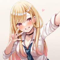 blonde hair, wearing what looks like a school uniform. The character is smiling and making
